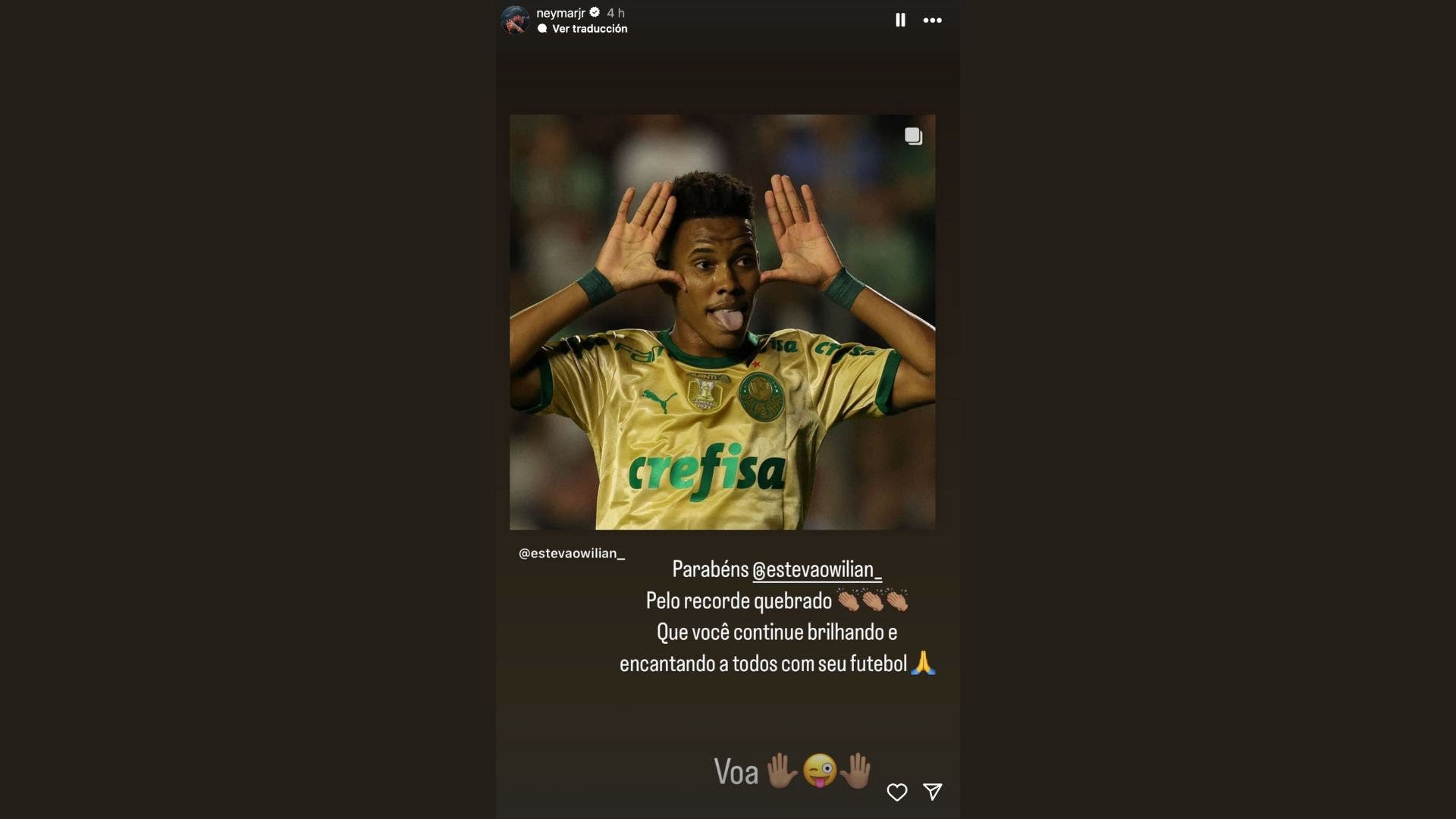 "Congratulations @estevaowillian on the record. I wish you continue to shine and enchant everyone with your football. Fly high," stated the veteran Brazilian international in a message on his social media, addressing one of the young players considered his successor in the national team.