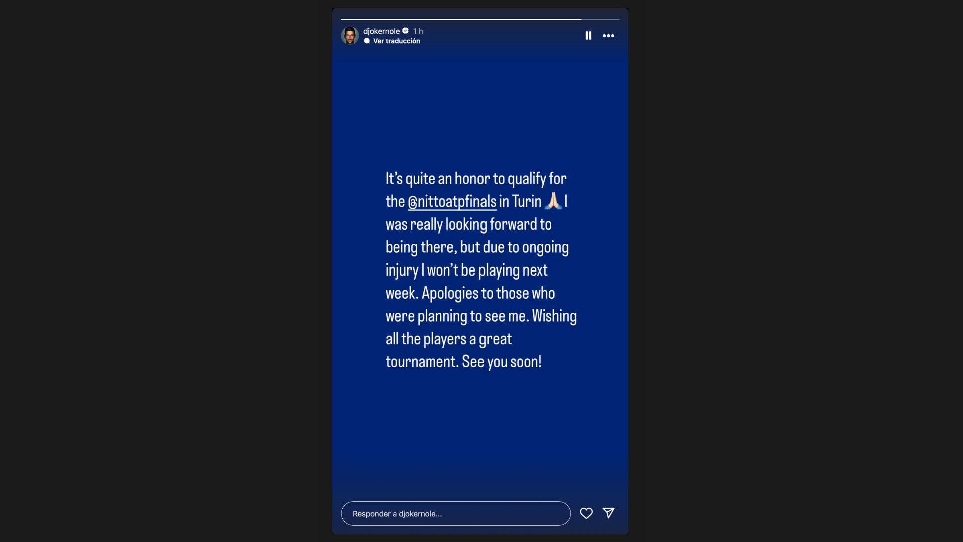 “It’s an honor to qualify for the ATP Finals in Turin. I was looking forward to being there, but due to an ongoing injury, I won’t be available next week,” he wrote on Instagram, without specifying the nature of the injury.