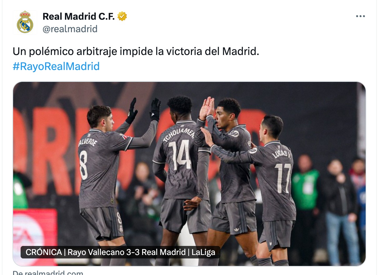 El Real Madrid expresó abiertamente su inconformidad con el arbitraje del partido ante el Rayo Vallecano, que terminó en un empate 3-3. A través de sus redes sociales, el club compartió un mensaje contundente: "Un polémico arbitraje impide la victoria del Madrid", acompañado de una imagen del equipo en pleno partido. Este mensaje ha generado un amplio debate en redes sociales y medios deportivos.
